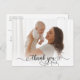 Elegante guión moderno de caligrafía recién nacido foto de bebé gracias postal. Presenta un hermoso texto de "gracias" en un guión de superposición de foto de tipografía de cola de flujo de caligrafía manuscrita. Al revés, un mensaje personal prefabricado en blanco y negro. Fácil de personalizar con la foto y los detalles de su bebé.