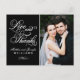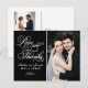 Elegante y dramática, esta tarjeta postal de agradecimiento presenta un panel negro atrevido con "Amor y agradecimiento" en elegante letra de caligrafía ornamentada blanca junto a la foto de su boda. Los nombres personalizables de la pareja se muestran en letra blanca y negrita, con un floreo decorativo debajo. Una opción impresionante para parejas con una estética de boda moderna, formal o de etiqueta negra.