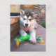 Ahorre en franqueo y sobre/papel cuando envíes esta adorable fotografía de primer plano de un cachorro de Malamute con una cuerda colorida y juguete para morder en la portada de esta postal. ©Patricia AZ Phillips. ¡Haga clic en Personalizar! para agregar texto en la parte delantera o trasera en un estilo de letra, tamaño y color que prefiera.