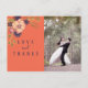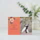 Tarjeta de agradecimiento de boda elegante, rústica y moderna en azul marino y coral con flores rosadas aguadas y foto personalizada.