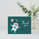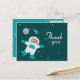 ¡Esta linda fiesta de cumpleaños de niños gracias foto postal tiene un tema fuera de este mundo! El fondo es de color verde azulado oscuro, con numerosas estrellas amarillas, blancas y grises en el fondo. Hay un astronauta a la izquierda con un lugar para que personalizares la fotografía como la cara del traje de astronauta. También hay una luna gris con una bandera estrella en la parte superior y un barco con cohetes flotando a la derecha de la luna. A la derecha, gracias está escrito. Al revés, hay un espacio para que escribas a mano en tu mensaje de agradecimiento en casa.