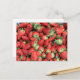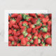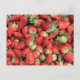 Una postal con una fotografía colorida que muestra un montón de extravagantes fresas rojas.