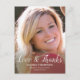 Envíe una elegante postal de agradecimiento a su familia y amigos por sus regalos de graduación. Este diseño muestra su foto en el frente con un guión moderno que lee. "Amor y Gracias" en tipografía negra con tu nombre, escuela y clase/año a continuación para personalizar. La parte posterior de la tarjeta tiene un ilustracion de un tapón de graduación y desplácese con un mensaje que usted puede personalizar. Diseñado por la artista ©Susan Coffey. Fotografía © Storytree Studios, Stanford, CA.
