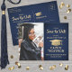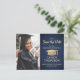 Comparte las alegres noticias de tu próxima fiesta de graduación, así como una foto con estos modernos tonos azul marino y oro, salvo las invitaciones de postales de fecha. La foto y todo el texto son simples para el personalizar. El diseño presenta un tapón de graduación de Relieve metalizado metálico falso dorado, caligrafía de escritura a mano escrita a mano, nombre de graduado en tipografía minimalista moderna, año de clase y escuela, y una foto de su elección, como una foto de la tercera edad o una imagen de la ceremonia de graduación. Tenga en cuenta que el oro es color impreso, no Relieve metalizado metálico. Esta elegante tarjeta de invitación de graduación es una manera elegante y moda de comenzar su celebración especial del día.