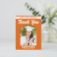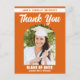 Esta moderna tarjeta de agradecimiento de graduación de anciano personalizada de naranja presenta tipografía blanca clásica del nombre de su universidad para la clase de 2025 y su foto de anciano bajo un arco de moda. Personalice con el año de su graduado bajo el elegante guión manuscrito debajo de su fotografía.