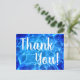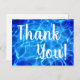 Foto de agua de piscina azul aguamarina con filtro brillante. Texto "gracias" en estilo caligrafía blanca. Cree sus propias tarjetas de agradecimiento después de su evento especial en un lugar junto a la piscina.