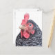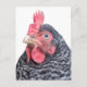 Este es un pullet de roca de Plymouth, joven y activo, o gallina ponedora. Este pollo en particular tiene un magnífico peine y batas rojas brillantes que se muestran agradablemente al lado de las hermosas plumas blancas de color negro. Una fotografía de color muy detallada, nítida y vibrante muestra el pájaro cerca, aislado en un fondo blanco. Perfecto para los criadores de pollos.