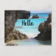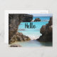Una postal con una fotografía panorámica de la costa tropical de las Bermudas. Las grandes rocas de barro contrastan con el mar turquesa y luminoso.