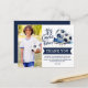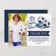 Tarjeta postal de agradecimiento moderna, trendy deportiva y dinámica para cumpleaños de niños de fútbol / fútbol, perfecta para jóvenes entusiastas del fútbol. El diseño presenta tipografía de escritura '' es hora del juego '', ilustración de acuarela con un balón de fútbol y zapatos en colores azules trendy, una sola foto y mensaje de agradecimiento en letras en negrita. Con características editables, puede personalizar sin esfuerzo la tarjeta postal de agradecimiento con el nombre y mensaje de su hijo o texto adicional.