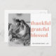 Celebra la temporada de gratitud con esta moderna tarjeta de foto personalizada de Acción de Gracias. Con la sincera frase "agradecido, agradecido, bendecido" en una tipografía elegante, esta tarjeta personalizado empareja maravillosamente la foto de su familia con un cálido mensaje de vacaciones. Perfecto para compartir amor, alegría y aprecio con amigos y familia durante la temporada de Acción de Gracias. Personalice con su nombre y año familiar para un mantenimiento verdaderamente único. Ya sea que mande a sus parientes por todo el país o que donen junto a su fiesta de vacaciones, esta elegante y minimalista tarjeta de Acción de Gracias es la manera perfecta de expresar gratitud.