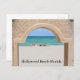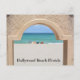 Vista al océano desde el Hollywood Beach Florida Broadwalk en una postal de turismo. A través de una ventana en la pared que bordea el paseo marítimo, se puede admirar la playa de arena y los diferentes tonos azules del agua y del cielo, así como una pizca de gente colorida en la playa con las sillas. Hay espacio para añadir texto adicional en la ventana de la arena. Esta es la fotografía original de JLW_PHOTOGRAPHY en la orilla del mar.