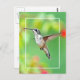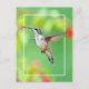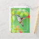 Un colibrí fotografiado en medio del aire con flores de enfoque suave como fondo.