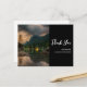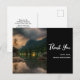 Tarjeta de agradecimiento con una hermosa fotografía. Una toma al atardecer con montañas y un lago tranquilo. Luces de cabañas apagadas a lo lejos.