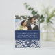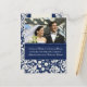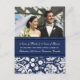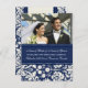 Invitación de Elopement Postales fotográficas en elegante color azul marino oscuro y color crema de damasco floral blanco, personalizable con tus nombres, foto de bodas y detalles de bodas, la manera perfecta de anunciar que te has fugado con amigos y familia. Disponible en una amplia gama de productos bodas a juego.
