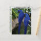 Una postal con una foto de dos loros azules sentados en una rama de un árbol en la selva tropical.
