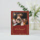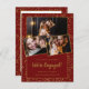 Confeti dorado decora el fondo rojo burdeos tanto en la parte delantera como en la trasera. Las fotografías de tres parejas son representaciones en la parte delantera. Todos los textos que aparecen a continuación incluyen la gran cantidad de "Nos comprometemos" que se puede editar para personalizar de su invitación de compromiso única.