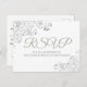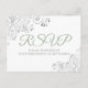 Estas bellas tarjetas postales RSVP le facilitarán a sus invitados responder a su invitación de boda con el número de asistentes y una selección de comidas, o para enviar sus lamentos. El diseño es sencillo pero elegante, con un texto verde y gris sabio y un Relieve metalizado floral de imitación de plata lacada.