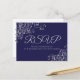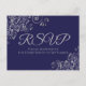 Estas bellas tarjetas postales RSVP le facilitarán a sus invitados responder a su invitación de boda con el número de asistentes y una selección de comidas, o para enviar sus lamentos. El diseño es sencillo pero elegante, con un texto gris plateado y un Relieve metalizado floral de imitación plateado bordeado por un fondo azul marino.