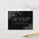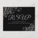 Estas bellas tarjetas postales RSVP le facilitarán a sus invitados responder a su invitación de boda con el número de asistentes y una selección de comidas, o para enviar sus lamentos. El diseño es sencillo pero elegante, con un texto gris plateado y un Relieve metalizado floral de imitación plateado sobre un fondo negro.