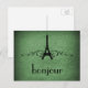 Grunosa pero elegante postal francesa floreciente de época en verde bosque con un diseño de la Torre Eiffel adornado con remolinos y puntos de moda y un falso fondo texturado de papel. Esta original postal de temática parisina es perfecta para saludar a cualquiera con un toque de humor francés. Fácil de personalizar, simplemente agregue el texto personalizado de su elección en el campo de texto proporcionado. Haga clic en el botón "Personalizar" para encontrar opciones de personalización adicionales.
