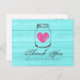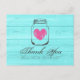 Panel de grano de grano de grano azul turquesa moda de cristal de masón tarro de agradecimiento a las tarjetas. ¡Amor y gracias! Parte de la temática rústica DIY. Un diseño exterior agradable con un corazón de color rosa de época descolorido. Perfecto para los matrimonios al aire libre en julio y agosto. También es agradable para la temática de la playa. Personaliza con el nombre de la novia y el novio más la fecha de casarte. Color del fondo del personalizable. Estilosa tipografía de escritura angustiada. Hermosa obra de arte para un boda de moda. Aqua y colores grises oscuros.