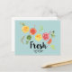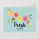 Una postal con un diseño bonito con cítricos que se tambalean - limones, limas y pomelo. La tipografía de moda dice "Fresh" con un lindo y burlón subrayado.