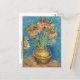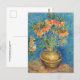 Postal de arte fino con la pintura post-impresionista del artista holandés Vincent van Gogh (1853-1890) titulada, Fritillaries in a Copper Vase (1887). La Fritillaria es una bombilla de primavera con flores. Una vida quieta de flores rojizo-naranja en una olla de cobre contra un fondo azul.