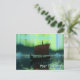 Una imagen un poco estilizada de un buque de larga duración Viking navegando por la noche bajo las luces boreales, hay un par de icebergs; la mayoría de la tripulación está durmiendo. El texto alemán "Fröhliche Weihnachten" aparece en azul y blanco resplandeciente. Añade tu propio texto adicional.