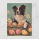 Celebre la Pascua con el inteligente y enérgico Collie Fronterizo en esta postal de estilo vintage. Con su querido perro rodeado de coloridos huevos de Pascua, flores de primavera florecientes y acentos festivos de temporada, este diseño es perfecto para los amantes de los Collie Fronterizos, los coleccionistas y los aficionados al arte nostálgico de las vacaciones. Un placer para compartir la alegría de Pascua.