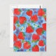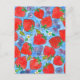 Una postal luminosa y colorida con un patrón de fresas rojas, arándanos, abejas y flores blancas dibujadas en pluma y tinta con acuarela con fondo de color azul cielo. Este diseño es de mi libro de colorear llamado "Lila's Garden: A Cottage Garden Coloring Book" que se puede encontrar en Amazon. ¡También puedes encontrarlo en otros artículos en mi tienda Zazzle!
