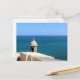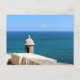 Foto de una casa de guardia de centinelas en un histórico fuerte en el Viejo San Juan, Puerto Rico con cielo azul y agua azul del Caribe al fondo.