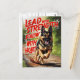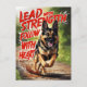 Un perro pastor alemán corre por un camino de tierra con una expresión determinada. El perro es representado de una manera estilizada, casi caricaturista, con líneas negritas y gráficas. La imagen va acompañada del texto Lead with Strength, Follow with Heart.