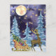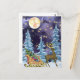 Magical watercolor illustration of a reindeer with sleigh in a forest with Christmas trees, covered with snow and lit by the light of the full moon in the starry sky.