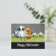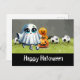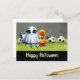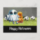 Postal Fútbol Feliz Halloween con bolas sobre hierba verd