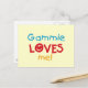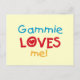 Gammie me ama las camisetas, tarjetas, pegatinas, los monos empaquetan, y más con diseño rojo, amarillo, y azul colorido del texto y del corazón. ¡Este Gammie me ama ropa y los artículos del regalo harán que el gammie sonríe!