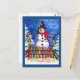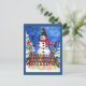 Original pintura acuarela de Sandra Gale de un hombre de nieve tradicional parado frente a una valla de piquete con brillantes luces de Navidades que reflejan la nieve del invierno. Aves, casas de pájaros y adornos navideños hacen de esto una escena clásica de Navidades que se ve genial en envolver papel, tarjetas de vacaciones y más!
