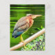 Un pájaro con un largo pico se alza sobre una metalizado barandilla, al lado de una valla de eslabón y vegetación, con una serena masa de agua como telón de fondo. La escena es vibrante con un follaje exuberante y reflejos en el agua.