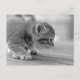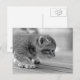 Fotografía en blanco y negro de un gatito muy lindo con ojos azules, agachado en un suelo de madera, listo para saltar. Un gran regalo para ti o para el amante del gato en tu vida.