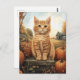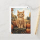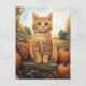 Pintura caprichosa de un gatito naranja mullido sentado entre calabazas en una granja rústica en otoño.