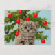 Tarjeta postal con un gato vintage y un árbol de Navidad. Un gatito gris esponjoso se sienta adorablemente frente a un árbol de Navidad verde. El árbol está decorado con adornos rojos y azules. ¡Un regalo acogedor para la temporada navideña y los amantes de los gatos!