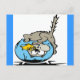 Postal Gato con la cabeza atascada en un tazón de pescado