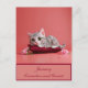 Un lindo gato de tabby, personalizado gris y blanco, se coloca sobre una almohada de color granate con claveles rosas cerca.