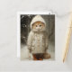 ¡Una postal adorable de un gatito naranja que parece estar emprendiendo una aventura! El gatito lleva una chaqueta y botas de invierno. La escena es muy linda. En el fondo hay un bosque. Los colores de este cuadro digital están inspirados en los estilos barroco y vintage. ¡Una postal perfecta para todo aquel que ame los gatos!