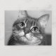 Muestra una fotografía en blanco y negro de la cara expresiva de un gato.