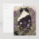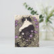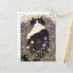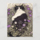 Un ilustracion digital de un dibujo de una línea de un gato con flores moradas.
