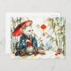 Postal Gato Geisha Blanco con paraguas rojos en las costa