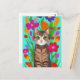 Tarjeta postal para mantener el contacto. Lindo gato gris de ojos verdes estilo arte popular. Este arte es generado por IA. Lindas flores azules, moradas y rojas con fondo azul verdoso. contenido generativo