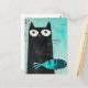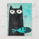 Un ilustracion cautivador de un gato negro con ojos blancos llamativos, sosteniendo un pez turquesa. La obra muestra una escena caprichosa y lúdica con detalles texturados y colores vivos.