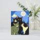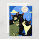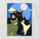 Postcard in In Un ilustracion de cuatro gatos en el prostíbulo, con ojos brillantes, se reúnen bajo un cielo nocturno, con luna llena y estrellas. El cielo es azul profundo, salpicado de nubes esponjosas.