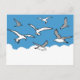 Postal para un observador de aves. Gaviotas volando sobre un fondo azul. Postales ornitólogas.